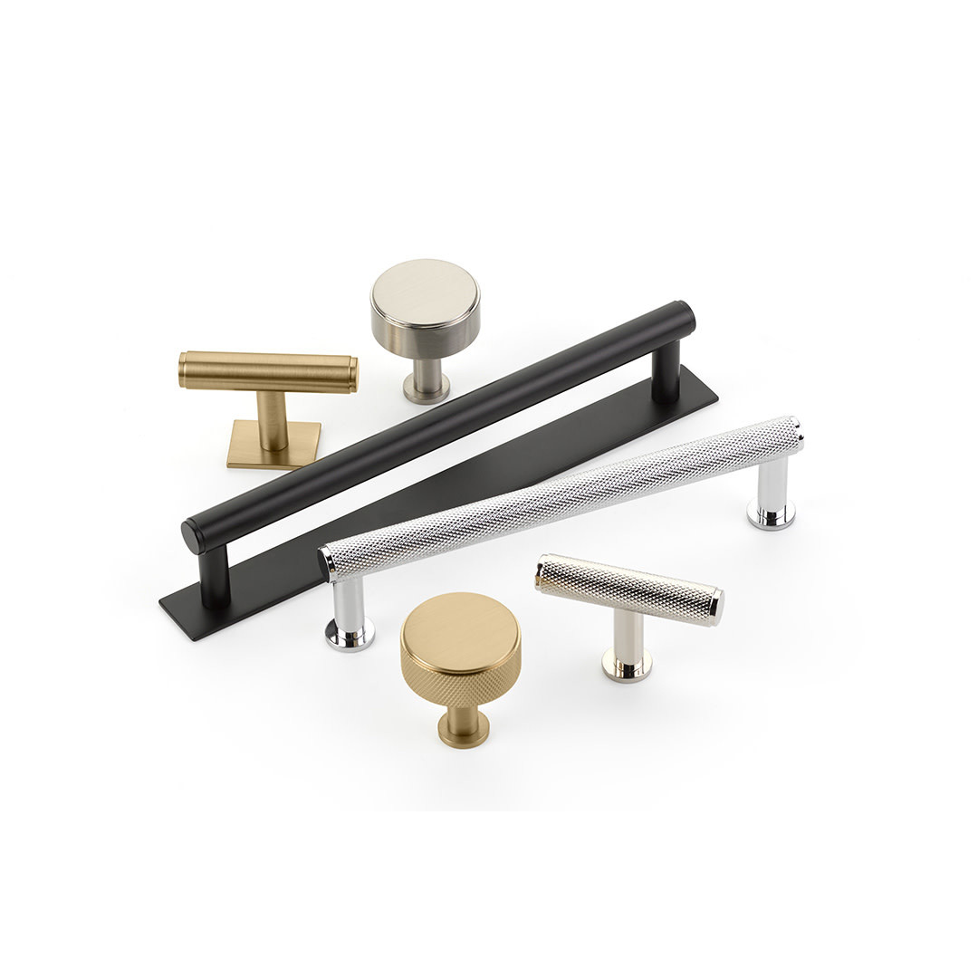 The classic bar pull handle that everyone knows and loves has taken on a whole new meaning with Schaub's Pub House cabinet handle and cabinet knob collection. Choose between a beautifully knurled texture or smooth knobs and pulls and a variety of luxurious finishes and add a backplate to finish the look off. This collection, inspired by an evening out at the pub, it gives the feel of warmth unlike any other collection.